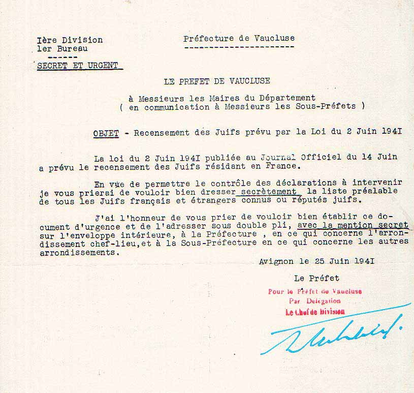 1941, Aimé Autrand donne l'ordre de recenser les Juifs "secrètement"