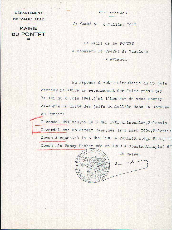 recensement est fait par le maire de mon village le 4 juillet 1941