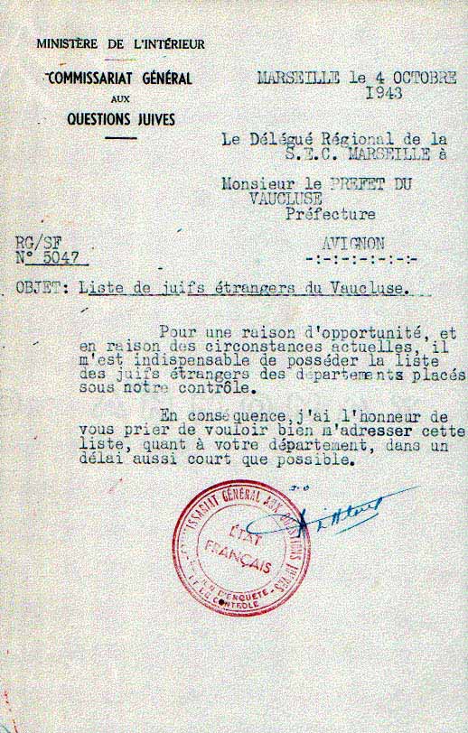 des Juifs est demandée à la préfecture Avignon par les Affaires Juives de